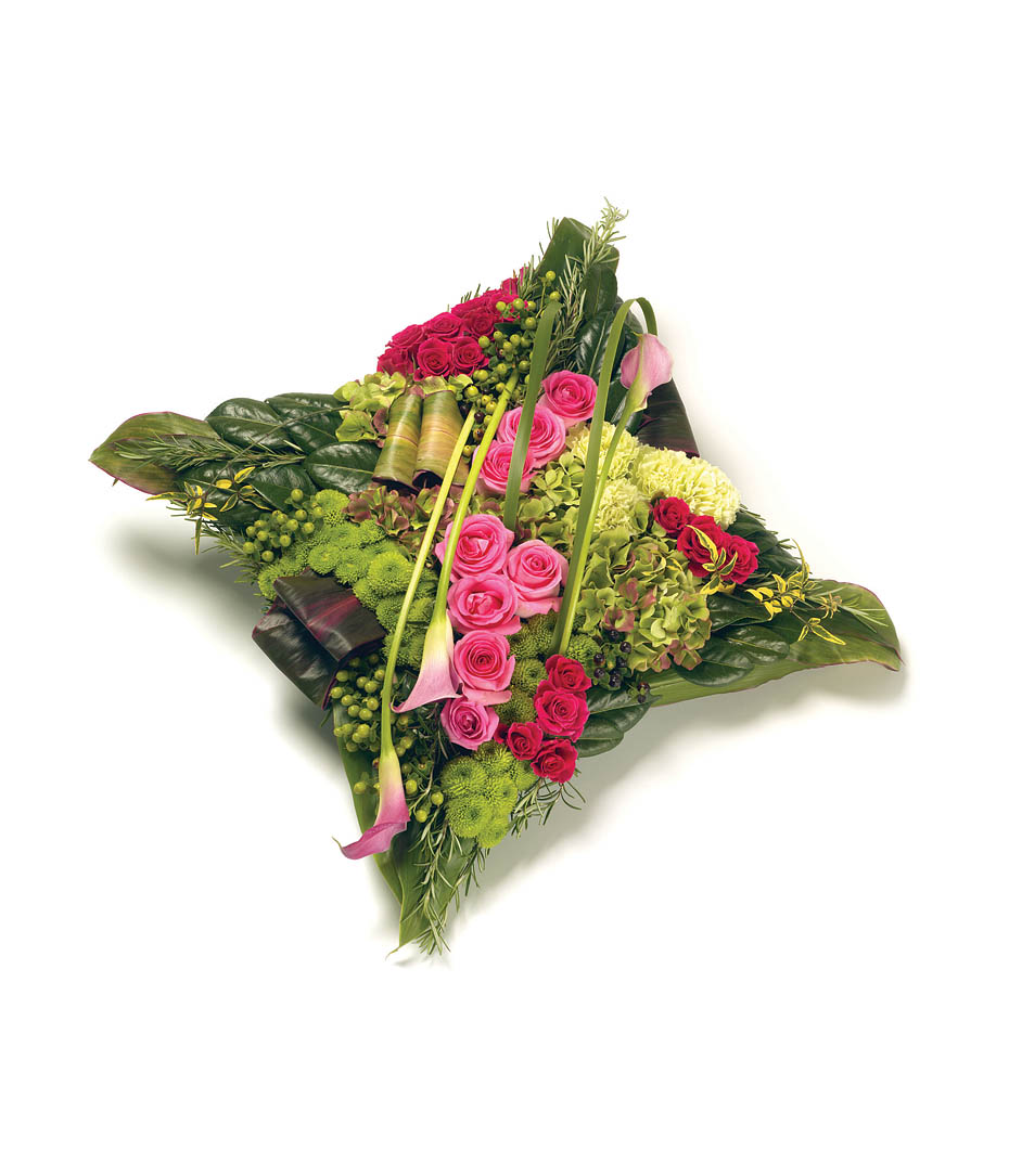 A stunning textured cushion design with an array of flowers & foliage including Roses, Hydrangea , Hypericum Calla Lilies and complementary foliage edging.