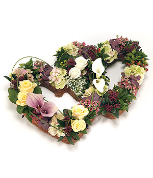 A stunning double heart shaped tribute in subtle colour scheme of pink, peach, bronze and lemon, including Lilies, Hydrangea, Roses and flowering foliage. Size: Height – 38cm (15″) Width – 58cm (23″).