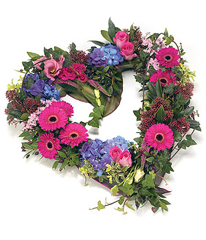 Textured open heart shape tribute in shades of pink and blue, including Roses, Gerbera, Hydrangea, Eustoma and complementary foliage edge. Size: Height – 43cm (17″) Width – 43cm (17″).