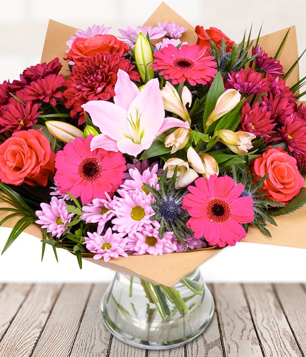 A gorgeous selection of utterly beautiful blooms, lovingly arranged by hand to create beautiful pink, lilac and purple hand-tied bouquet. Featuring roses, lilies, gerbera, chrysasnthemum, eryngium gypsophila and seasonal foliage.