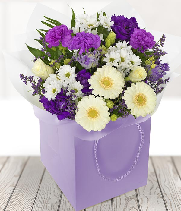 A sumptuous mix of purple and whites all ready to be displayed in a handy gift bag.