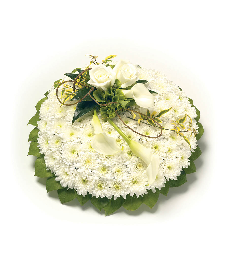 A white Chrysanthemum based posy with foliage edge, decorated with a classic spray of white Roses, Calla Lilies and complementary foliage.