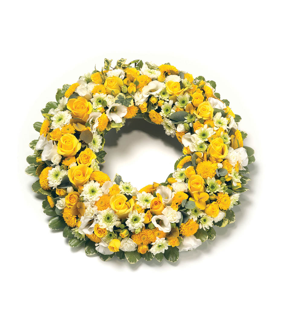 Open round yellow and white wreath with natural foliage edge including roses, Chrysanthemums, White Eustoma, and White Spray Carnations.